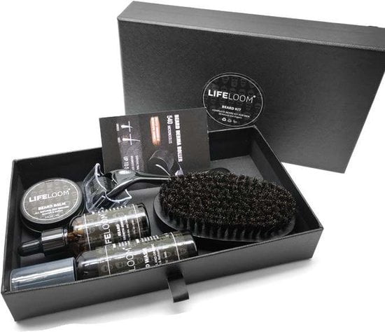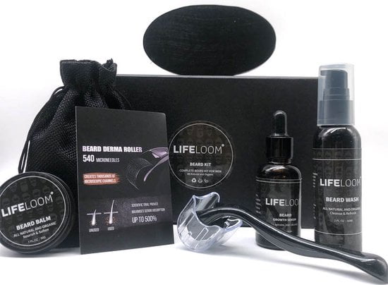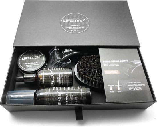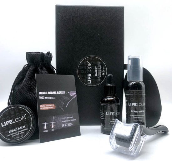 LifeLoom® baardgroei kit met dermaroller + baardshampoo + baardgroei-serum + baardbalsem + borstel + linnen bewaarzakje in mooie geschenkdoos.